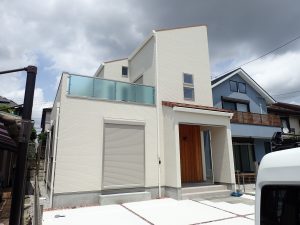 天然木の外壁で質感がいい感じです。また、ベランダも大きくみんなでバーベキューなんていいですね。